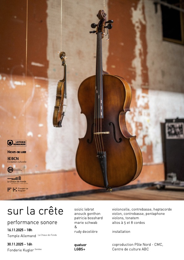Les musiciennes du Quatuor LGBS ont entrepris en 2023 un travail au long cours avec l’artiste sonore Rudy Decelière. De la richesse de leur exploration commune est né le désir pour chacune de proposer un principe créateur spécifique ouvrant plusieurs voies à cette création collective ambitieuse et kaléidoscopique. L’objectif étant de faire converger l’ensemble de ces principes créateurs dans la visualisation d’un objet global situé dans les interstices d’une performance et d’une installation. Cet objet prendra corps autant dans le temps que dans l’espace, travaillant la matière sonore autour de dispositifs activés ponctuellement qui se compléteront au fil du temps. Le public sera invité à perdre la mesure du son qui est produit, le quatuor n’étant plus envisagé comme seul producteur de son. Perdre la mesure de la source, du support de diffusion, du temps qui s’étire dans un espace qui s’imprègne de ce qui est à l’œuvre. Le public investira les lieux de la performance dans son intégralité en trouvant sa juste distance vis-à-vis des musiciennes et des éléments installatifs. Ces derniers se déploieront dans l’espace de manière subtile, jouant de croisements, de lignes tendues et d’éléments suspendus en mouvement. Chaque élément de cet ensemble entretient un rapport singulier à l’attention qui s’aiguise et se met au diapason de l’infime, du presque inaudible comme autant de dispositifs attentionnels défiant le rapport à l’événement et à la résolution.